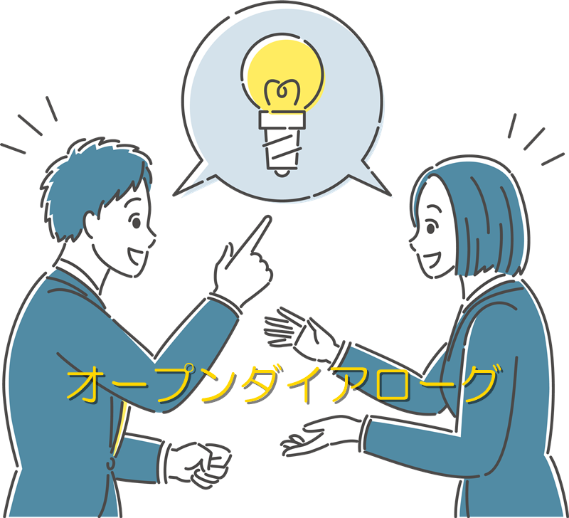 精神療法の一種で、本人・家族・専門職が対等な立場で対話を続ける手法です。「中断しない」「結論を急がない」などの原則を重視し、多角的な視点を共有することで、問題の解消を目指します。また、ビジネスにおいては、「答えを出す」ことよりも、「全員が共通の土俵に立っている」という感覚を作るためのツールとして活用されます。