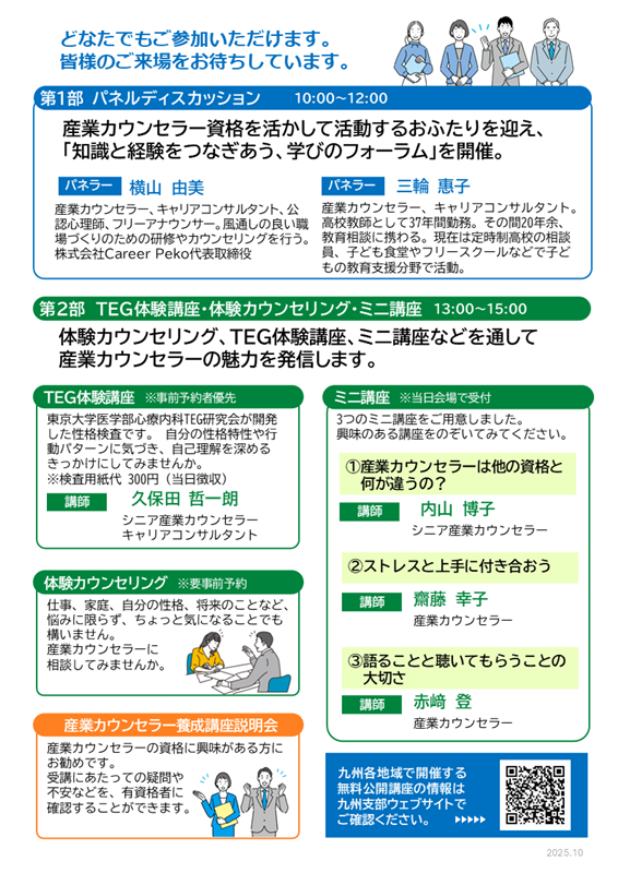 私が所属する日本産業カウンセラー協会では、11月23日を「産業カウンセラーの日」(日本記念日協会認定)と定めています。毎年、私たち産業カウンセラーの活動を知っていただく機会として、九州では今年も無料のイベントを開催します。現在、開催に向けて準備を進めているところです。お気軽にご参加ください。